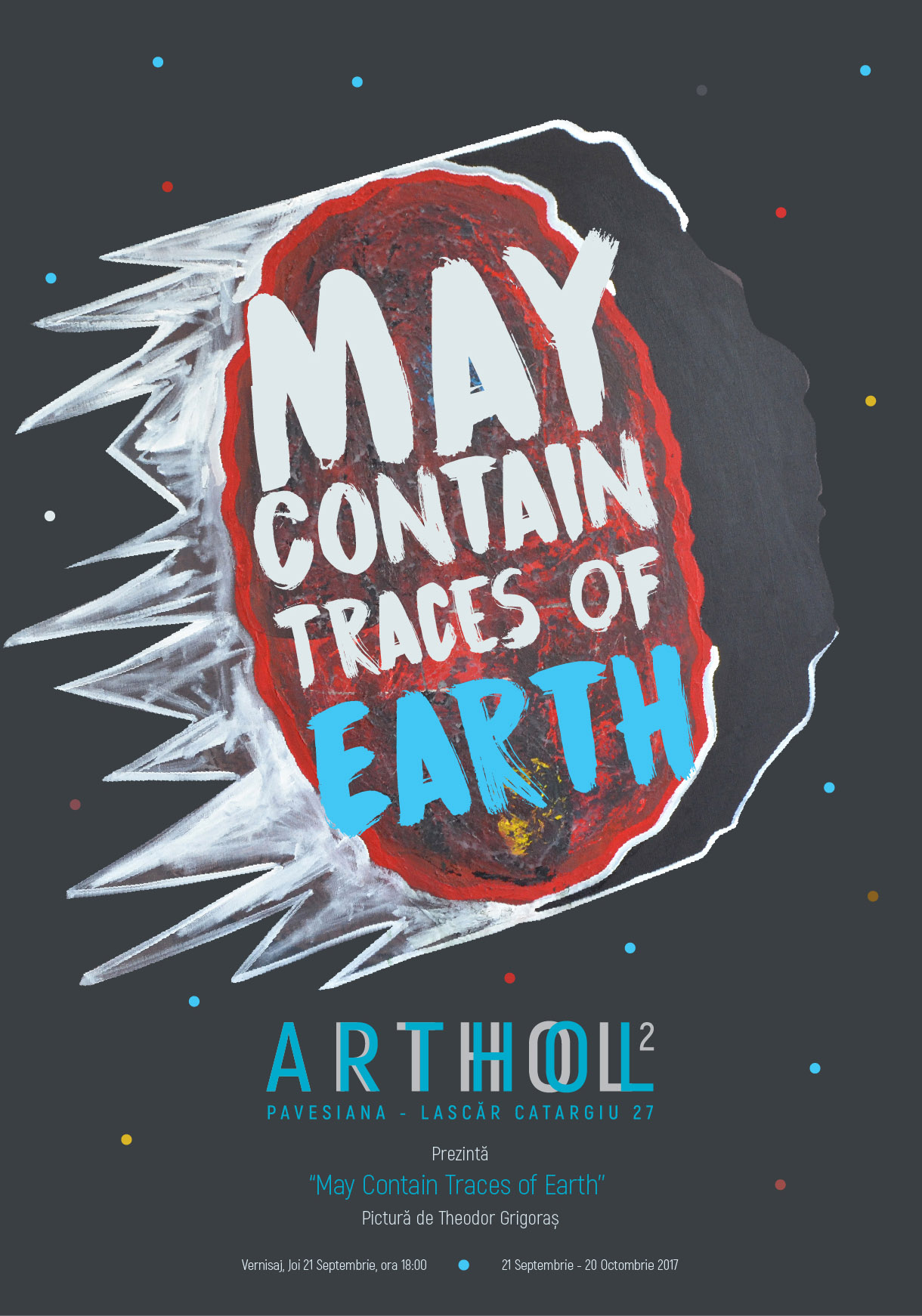 ‘‘May Contain Traces of Earth’’ este un proiect artistic care studiază, prin mijloace vizuale, geneza și mecanismele de funcționare ale Universului, aşa cum sunt ele percepute de către om. Jocul cu motivele vizuale și conceptuale începe la nivelul microcosmic, sau cel al prezenţelor subatomice, și se întinde spre macrocosmos, până la nivelul sistemelor de corpuri cerești. Elementele recognoscibile din domeniul fizicii, astronomiei sau al biologiei alternează cu elemente pur imaginare, provenite din lumi interioare ale omului, încărcate de subiectivitate. În acest demers am cautat o substanță comună care stă la baza tuturor lucrurilor și care le animă, am căutat o matrice nevăzută care transcende limitele spațiu-timpului și leagă realul de imaginar. Tipul de procese pe care le reprezint sunt procese care se repetă la infinit, în sfere variabile. Din acest motiv, desenele și picturile reprezintă, în aceleași imagini, elemente din lumi diferite, care se întrepătrund și care au la bază aceleași mişcări şi principii. Proiectul are ca puncte de reper relațiile dintre conștiință și materie, încercând să fixeze în imagini unele dinamici ale existenței. Lucrările doresc să realizeze o punte vizuală între lumea fizică și lumea interioară a omului. Elementul uman nu poate fi scos din ecuație atunci când contemplăm Universul. Omul creează în sine o imagine despre lume bazată pe simțurile sale, însă, această imagine este rezultatul unui amalgam de elemente diferite din interior și exterior și este departe de a fi o reprezentare obiectivă a realității. Titlul seriei de lucrări ‘‘May Contain Traces of Earth’’ ne trimite cu gândul la Pământ, această sferă a gândirii, locul care ne oferă șansa de a sta în primul rând atunci când contemplăm frumusețea universului. Locul în care problemele zilnice devin nesemnificative când sunt raportate la spațiul cosmic. Cosmogonia este o temă recurentă în artă și, în general, în cultura umană, de la începuturile istoriei şi până astazi. Acest subiect se adresează unor nevoi umane, nevoia de a înțelege de unde venim şi de ce existăm. De aceea, cred în potențialul nelimitat şi în actualitatea temei, care, nefiind un subiect exclusiv al vremii, va fi de interes şi în viitorul îndepărtat. Fiecare epocă va trata în maniera sa această temă, în strânsă relaţie cu sistemele de credinţă şi cunoștințele conexe din diferite domenii.